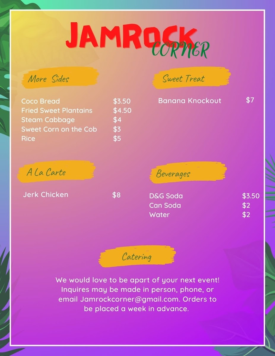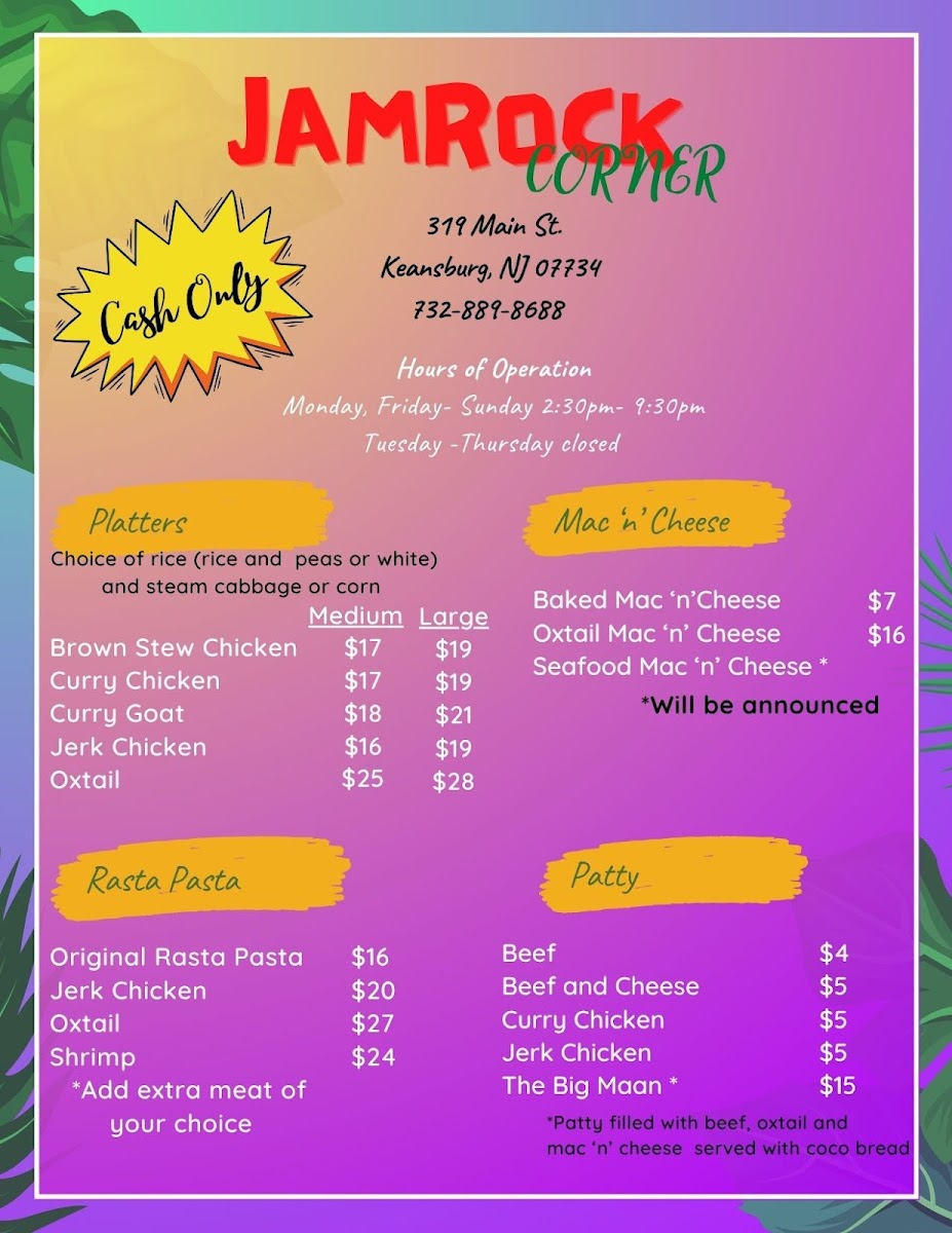 From a reviewer's perspective, the menu at Jamrock Corner on 319 Main St, Keansburg, NJ, offers a vibrant mix of Caribbean flavors that cater to both casual and hearty appetites. Their sides, including Rice, Coco Bread, Sweet Corn on the Cob, Honey Butter Sweet Potato, Cornbread, and Salt Fish Fritters, set the stage for a satisfying meal. Comfort food lovers will appreciate the variety in Mac ‘n’ Cheese, from Baked Mac ‘N’ Cheese to indulgent Seafood Mac ‘N’ Cheese and Oxtail Mac ‘N’ Cheese. For main courses, the Platters section shines with Fried Chicken, Curry Chicken, Brown Stew Chicken, Jerk Chicken, and Curry Goat, while the Anniversary Special adds unique twists with Roti and Curry Chicken, Roti and Curry Goat, and the sweet-savory Chicken and Waffles. Pasta fans are treated to the Rasta Pasta lineup, featuring Original Rasta Pasta, Jerk Chicken Rasta Pasta, Salmon Rasta Pasta, Oxtail Rasta Pasta, and Shrimp Rasta Pasta. The A La Carte options, including Jerk Chicken, Fried Chicken - 2 or 3 pcs, and French Fries, offer flexible portions, while the selection of Pattys-from Big Man to Jerk Chicken, Veggie, Curry Chicken, and Beef Patty-adds portable flavor. Sweet finishes are highlighted by the Banana Knock Out, and refreshing beverages like Cream, Jamrock Orange, Pineapple Ginger Beer, and Jamrock Grape complete the experience. A special mention goes to Seafood Friday, featuring Escovich (Red Snapper), Fried Jumbo Shrimp, and Whitings, giving patrons a reason to return weekly. Overall, the menu balances classic Caribbean staples with inventive twists, ensuring every visit to Jamrock Corner is flavorful and memorable.